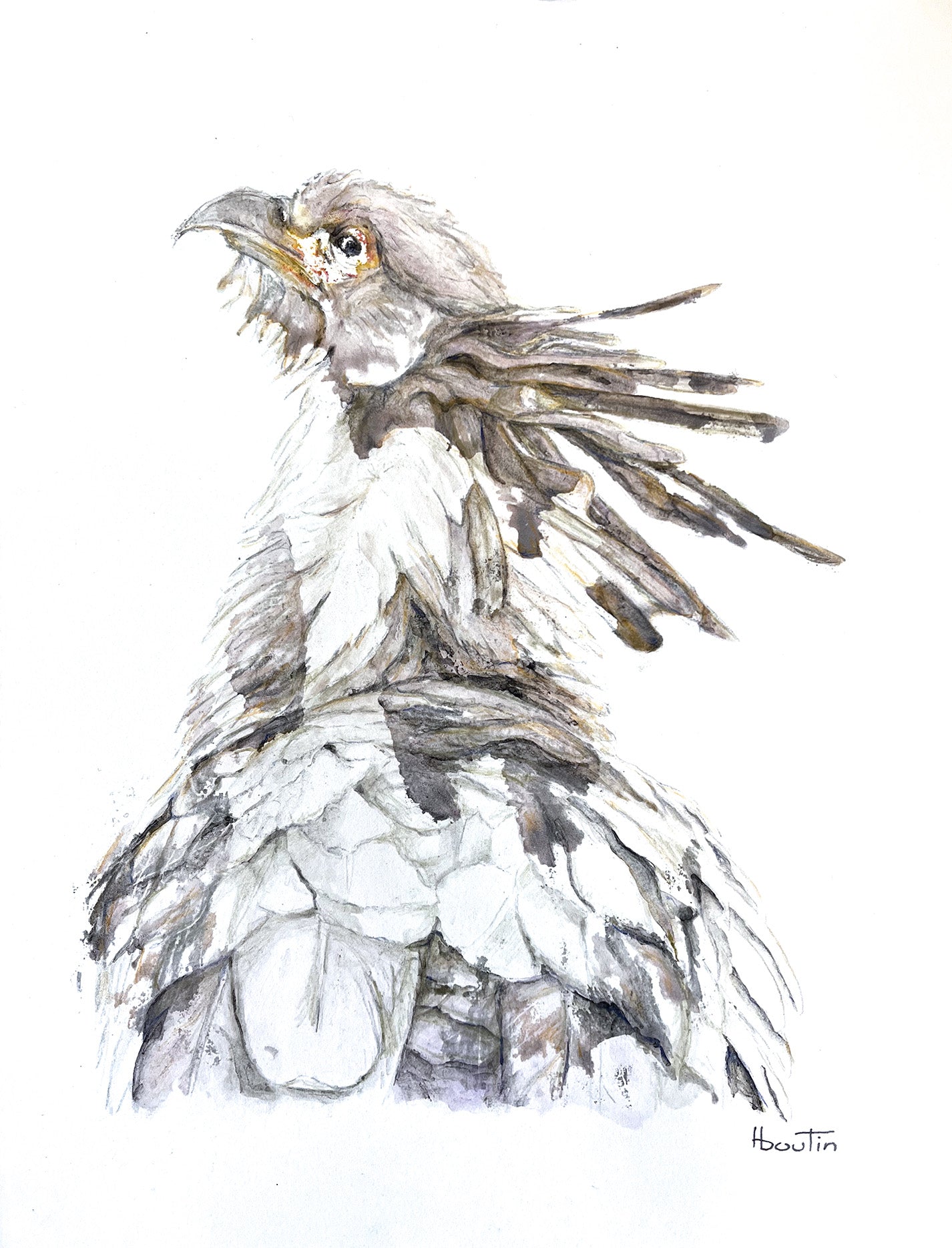 The artwork depicts a detailed pastel « à l’écu » painting of a bird, likely a heron or crane, with an elongated neck and an intricate plumage. The feathers exhibit a blend of muted colors, including purples, browns, and grays, with highlighted areas around the neck and back that enhance the bird's textured appearance. The bird's eye is a striking yellow, adding a vivid focal point to the composition, while its beak is long and slender, rendered in shades of orange and brown. The artist employs a delicate brushwork style, capturing the bird's elegant and somewhat scruffy elegance against a minimalist white background, which brings the bird into sharp focus.